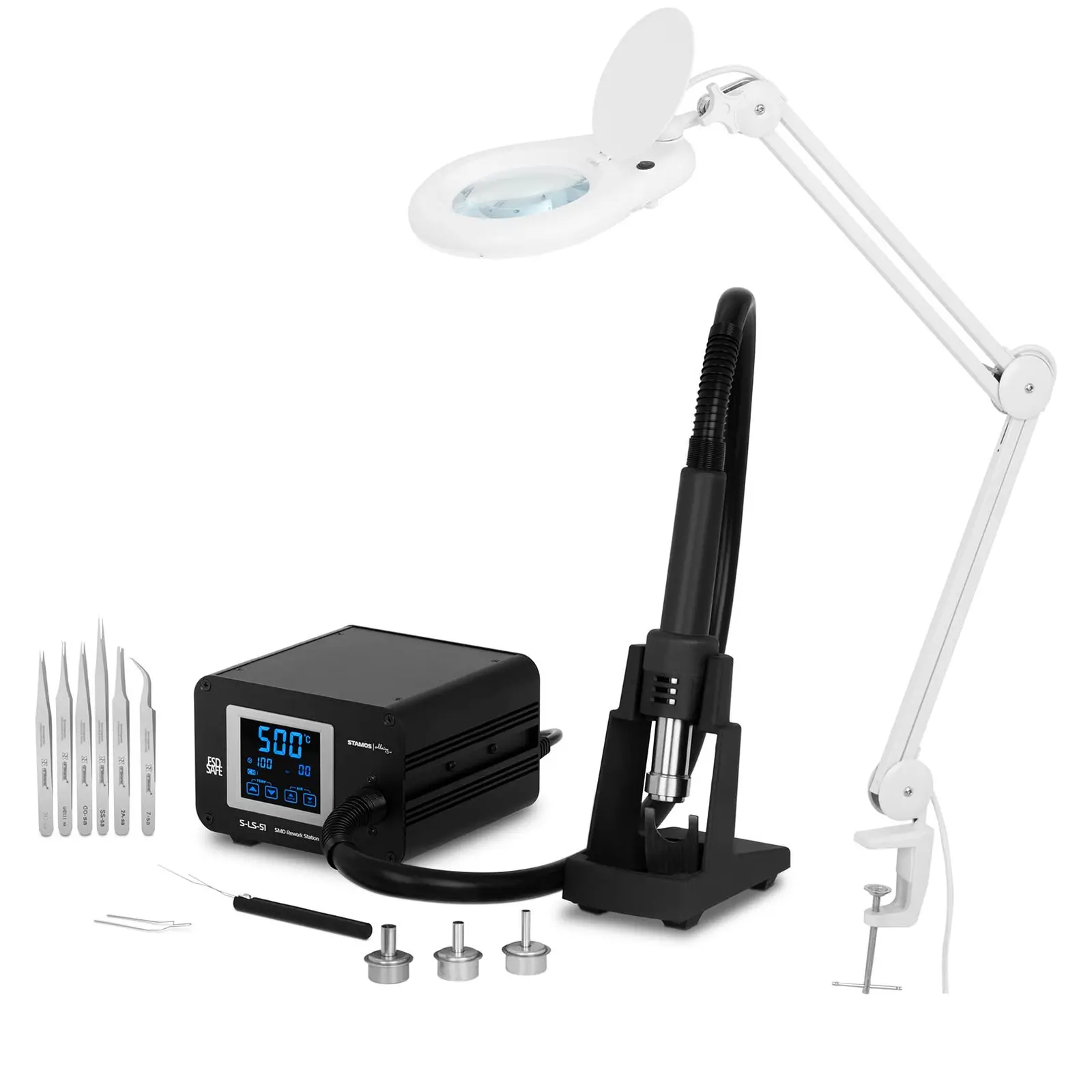 A hot air gun is preferable to a soldering iron when soldering on circuit boards with very small soldering joins. With this device, you can perform extremely precise SMD rework tasks and precisely select all your values via the digital LCD touch display.