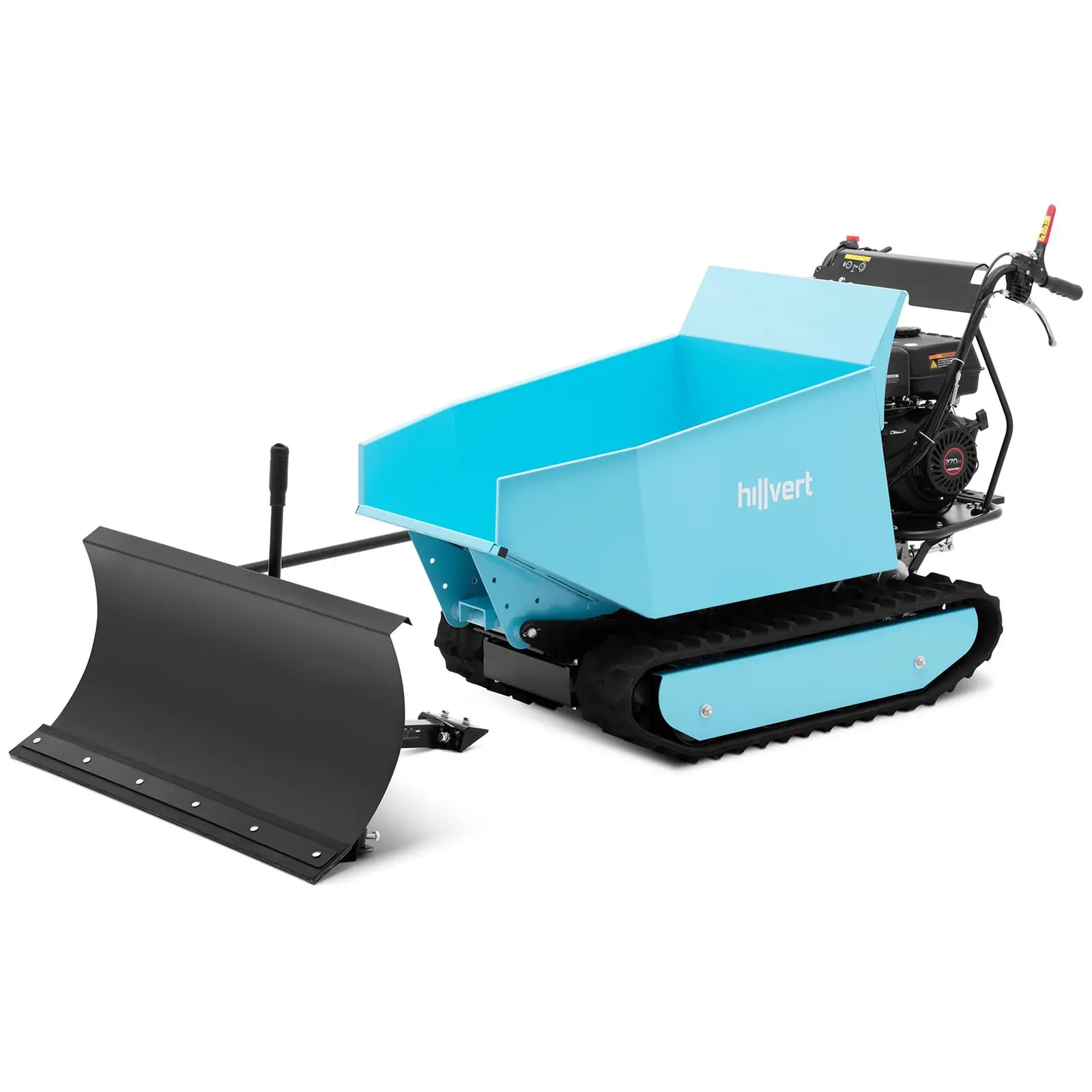The motorised wheelbarrow from hillvert's high-quality professional tools offers powerful performance combined with the best manoeuvrability and an adjustable tipping container. This makes the motorised barrow the ideal means of transport for excavating earth, rubble, stones and bulky materials or construction equipment with a total weight of up to 500 kg, both in gardening and landscaping as well as on construction sites. With the accompanying snow plow, you can also clear driveways, sidewalks or courtyards and gardens from large amounts of snow in just a few steps.
