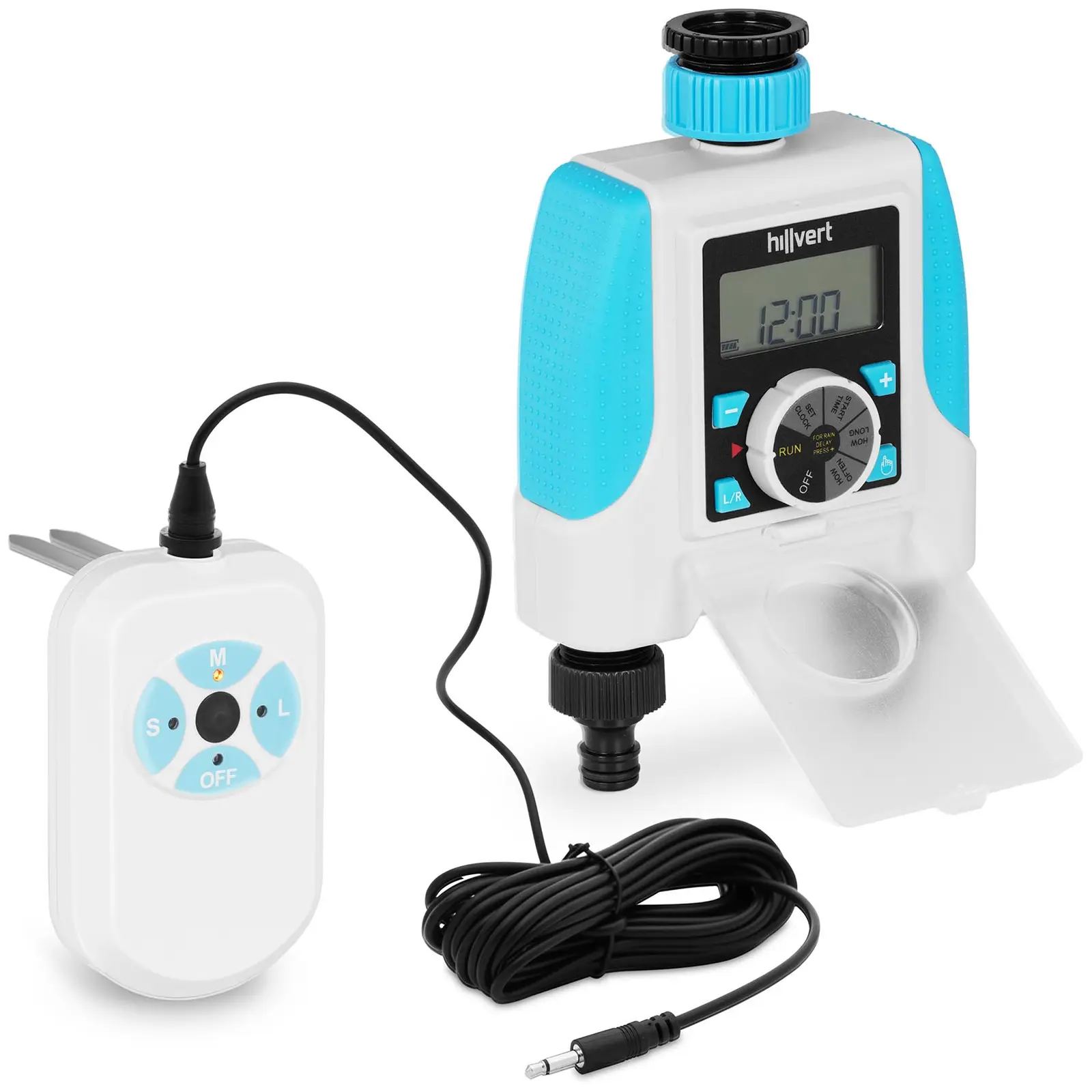 The irrigation computer can be connected to a humidity sensor, which is included in this set. With the help of the sensor, you can determine the water requirement even more precisely and skip watering times if necessary. In this way, the water requirement is optimally adapted to the environmental conditions and you prevent unnecessarily large amounts of your valuable water from seeping away unused in the garden soil. In addition, you can purchase a rain sensor (10090181) from hillvert at expondo, which provides valuable information for the required water quantities.
