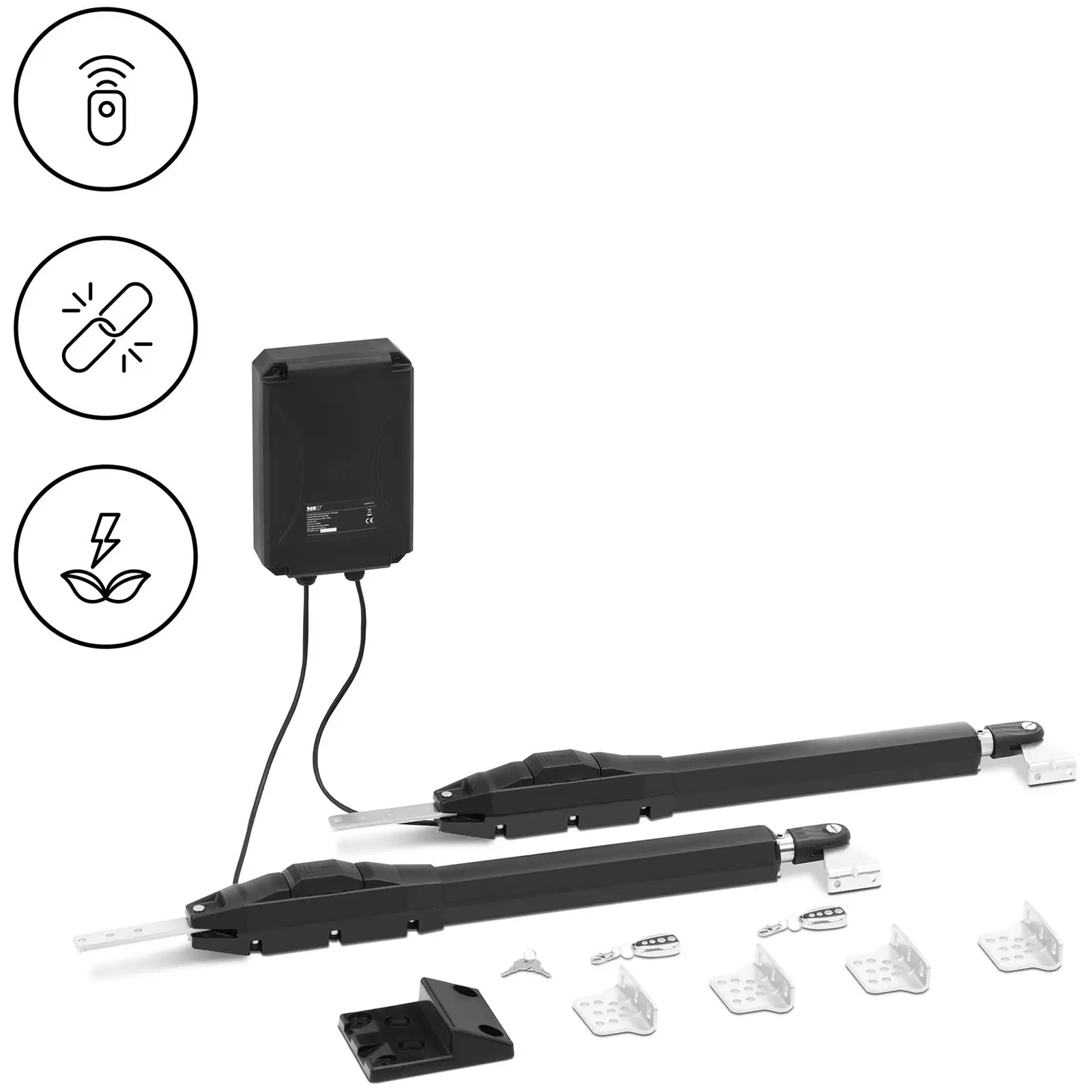 Perfect for private homes and gardens, agricultural, commercial, and industrial settings, the electric swing gate opener from MSW ensures total convenience and increased security for your property. The door operator opens 2 swing gates with a length of up to 2 metres and a maximum weight of 2 kg. 200 kg.