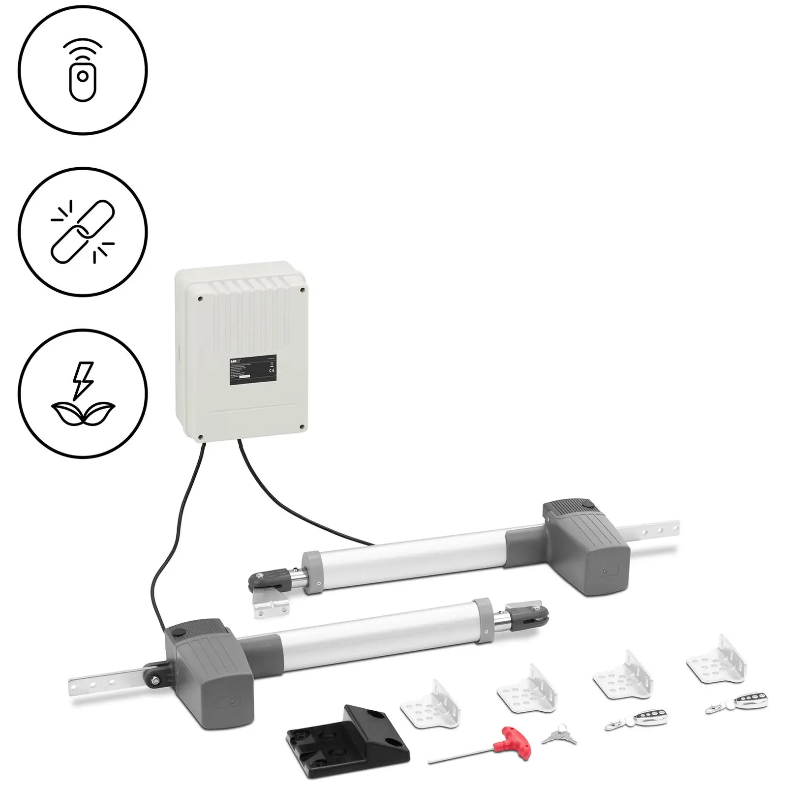 • Convenient – door opener for 2 swing gates with 2 small remote controls for easy operation
