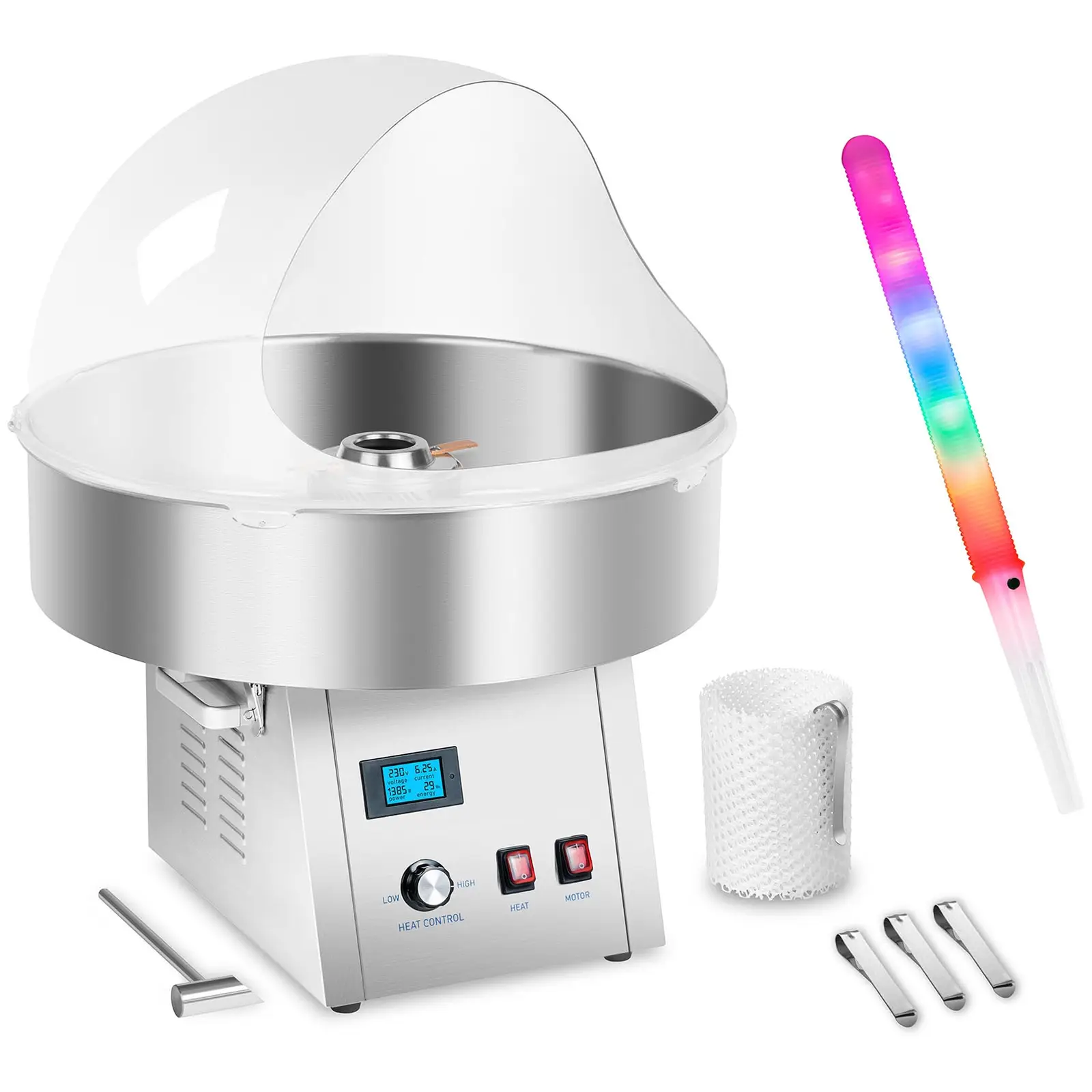 Candy Floss Machine Set with LED Cotton Candy Sticks - sneeze guard - stabiliser net - 62 cm - 1,500 W