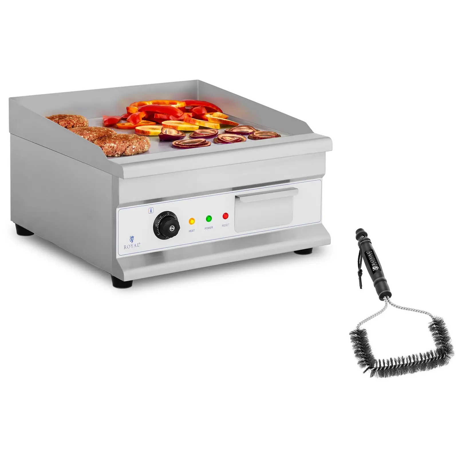 The commercial gas griddle is 50 cm wide and is fitted with both a side and rear splash guard. This protects your grilled food not only from wind and heat loss, but also prevents it from falling down or grease from spattering your equipment. The 1 cm-thick and 50 x 40 cm grill plate is made of carbon steel, which perfectly transfers the heat to your food. The smooth surface is very hygienic and prevents the electric flat top grill from warping due to heat.