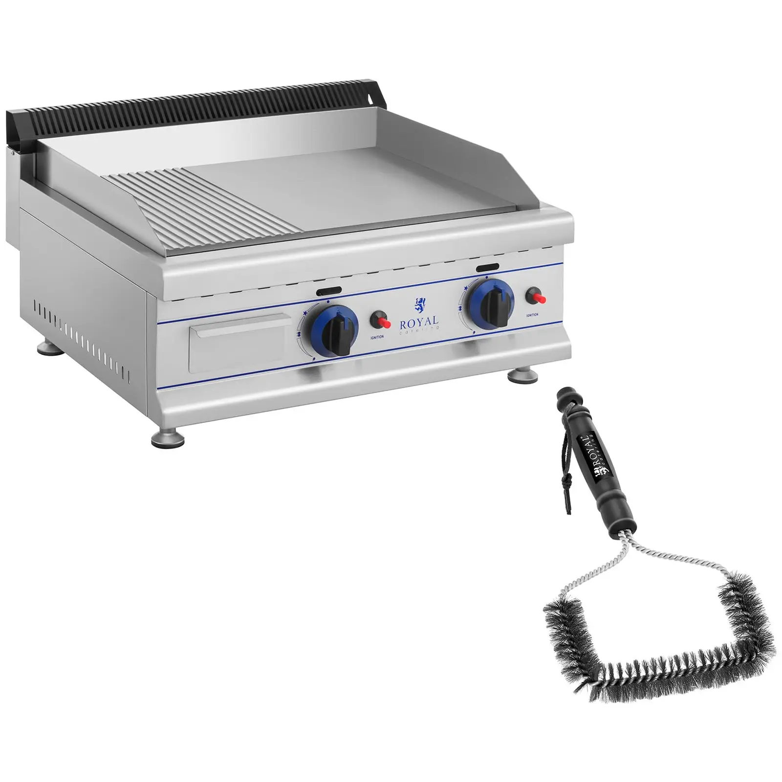The RCGL 65GE20H double gas griddle from Royal Catering is a professional piece of cooking equipment designed for hotel restaurants, cafés, fast food restaurants and catering companies, as well as for private use. The gas griddle is versatile, easy to clean thanks to the included brush and can be used both indoors and out thanks to its compact size.