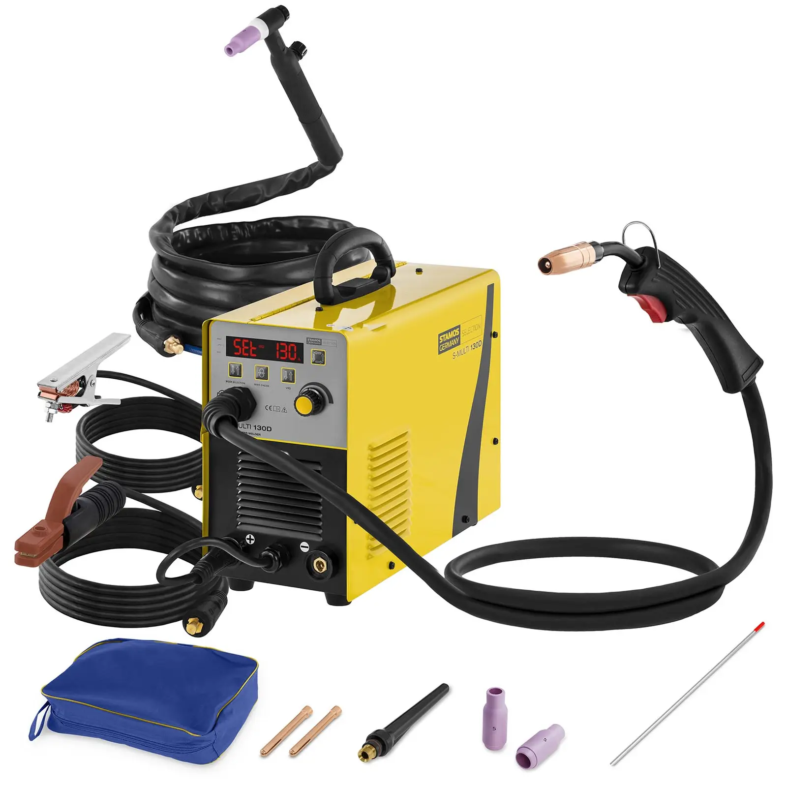 The welder S-MULTI 130D by Stamos Selection can be used as a MIG/MAG welder as well as an electrode welder (MMA). With this set, you will also receive the Liftarc TIG torch 10020728, which you can use for WIG welding. The 3-component combination welder can be used for metalworking as well as repair and maintenance work. It is a versatile all-round device.