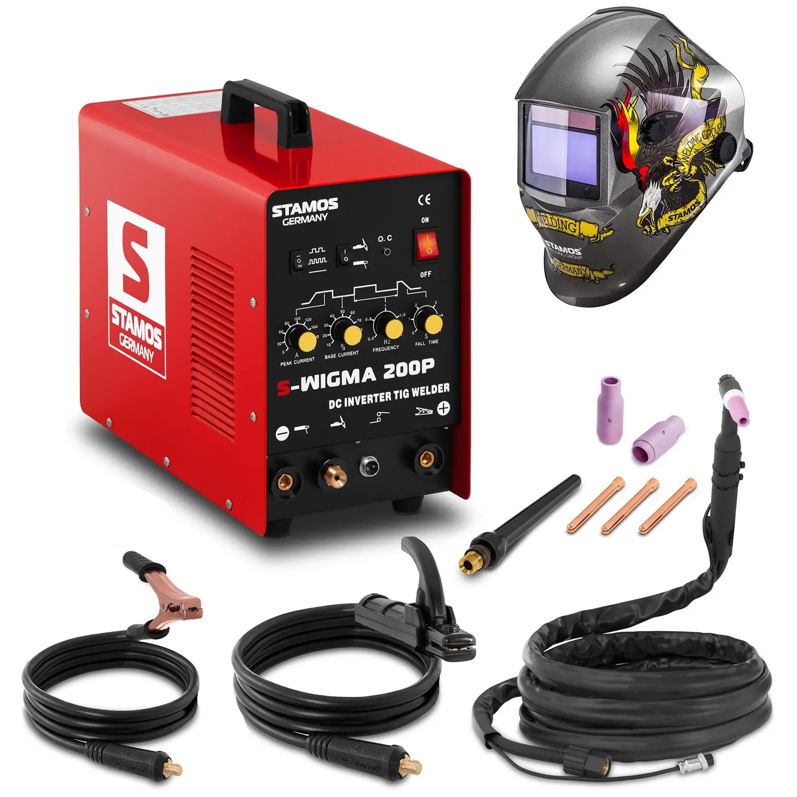 The TIG welding device S-WIGMA 200P by Stamos Germany is a robustly built, highly reliable welding machine. It has an input voltage of 230 V and measures 16 x 36.50 x 24 cm while weighing just 13.15 kg due to the use of lightweight, sturdy materials. This makes the S-WIGMA 200P one of the lightest TIG welding machines with pulse function. The machine offers welding current settings between 5 and 200 A, providing great flexibility for all kinds of conditions. Automatic adjustment of the ignition energy (for both high-frequency and Liftarc ignition) ensures optimum ignition characteristics.