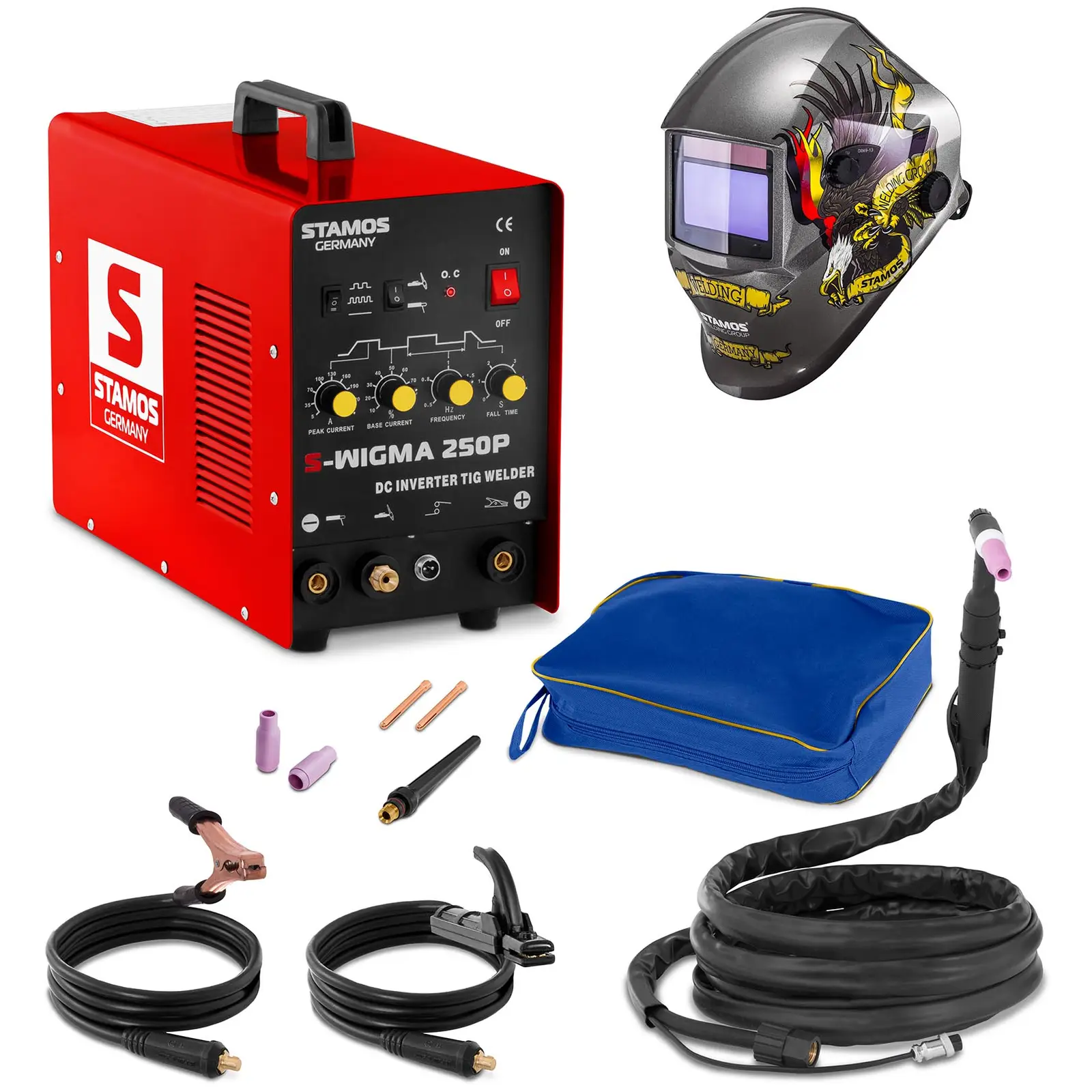 The inverter welder S-WIGMA 250P by Stamos Germany is marked by highest reliability thanks to the robust construction and use of newest technologies. It works with an input voltage of 230 V and, thanks to the stable but light materials, has a weight of only 10.95 kg at 20 x 43 x 29 cm size. The S-WIGMA 250P’s welding current can be regulated between 5 and 250 Ampere so that the device can be ideally adjusted to individual conditions. The TIG welder S-WIGMA 250P works with the MOSFET technology and reaches an energy use efficiency level of 93%. Here the welding seams high quality is ensured through a constant power supply.
