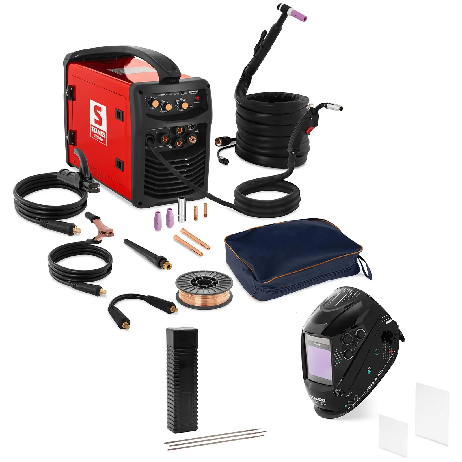 Choose the S-MIGMA 250.IGBT combination welder from Stamos Germany for a professional, innovative and high-quality tool. Use the MIG/MAG, MMA, TIG and FCAW welding processes for various repair and maintenance work, with which you can join metals together efficiently and safely. For your safety, the Colour Glass Y-100 welding helmet is made of the indestructible TECAMID 66 material blend. Thanks to the true colour view, you can see all the details even more precisely. Whether you need them for shipbuilding, pressure vessels or bridges, with the stick electrodes you can reliably weld high-strength steel structures that are exposed to static and dynamic loads. The basic electrodes measure 2.5 x 350 mm and come in the packaging size of 5 kg.