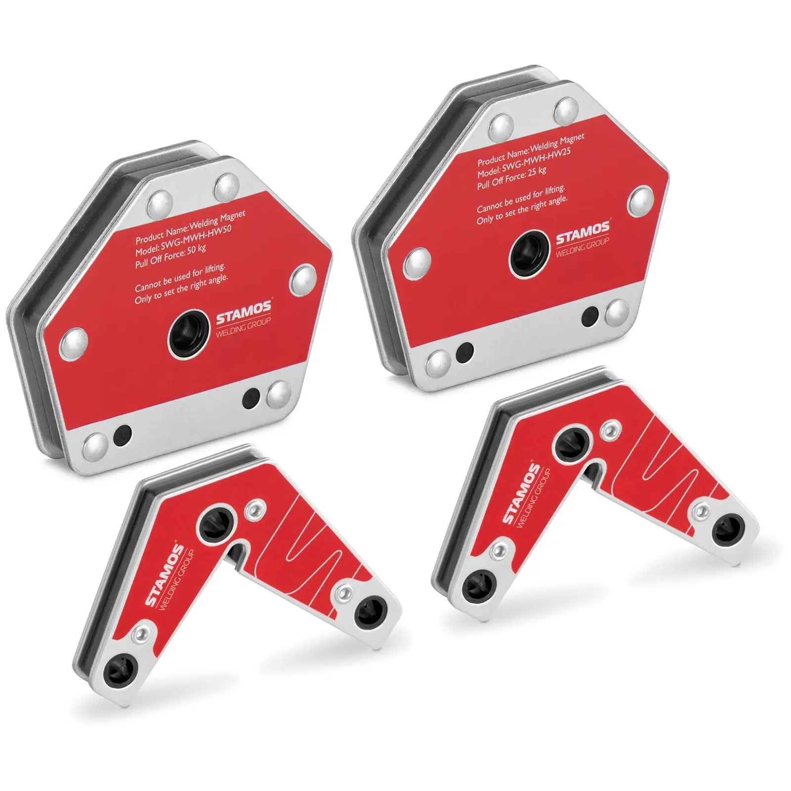 Use the arrow-shaped design to align your work according to your requirements. The first two welding magnets offer you positions at angles of 60 and 90° with an adhesive force of 17 kg. The other two welding magnets enable you to make connections with the angle dimensions 30, 45, 60, 75, 90 and 105°, differing only in the holding force of 25 and 50 kg. With the variable welding magnet set you will find the optimal solution for numerous metal works.