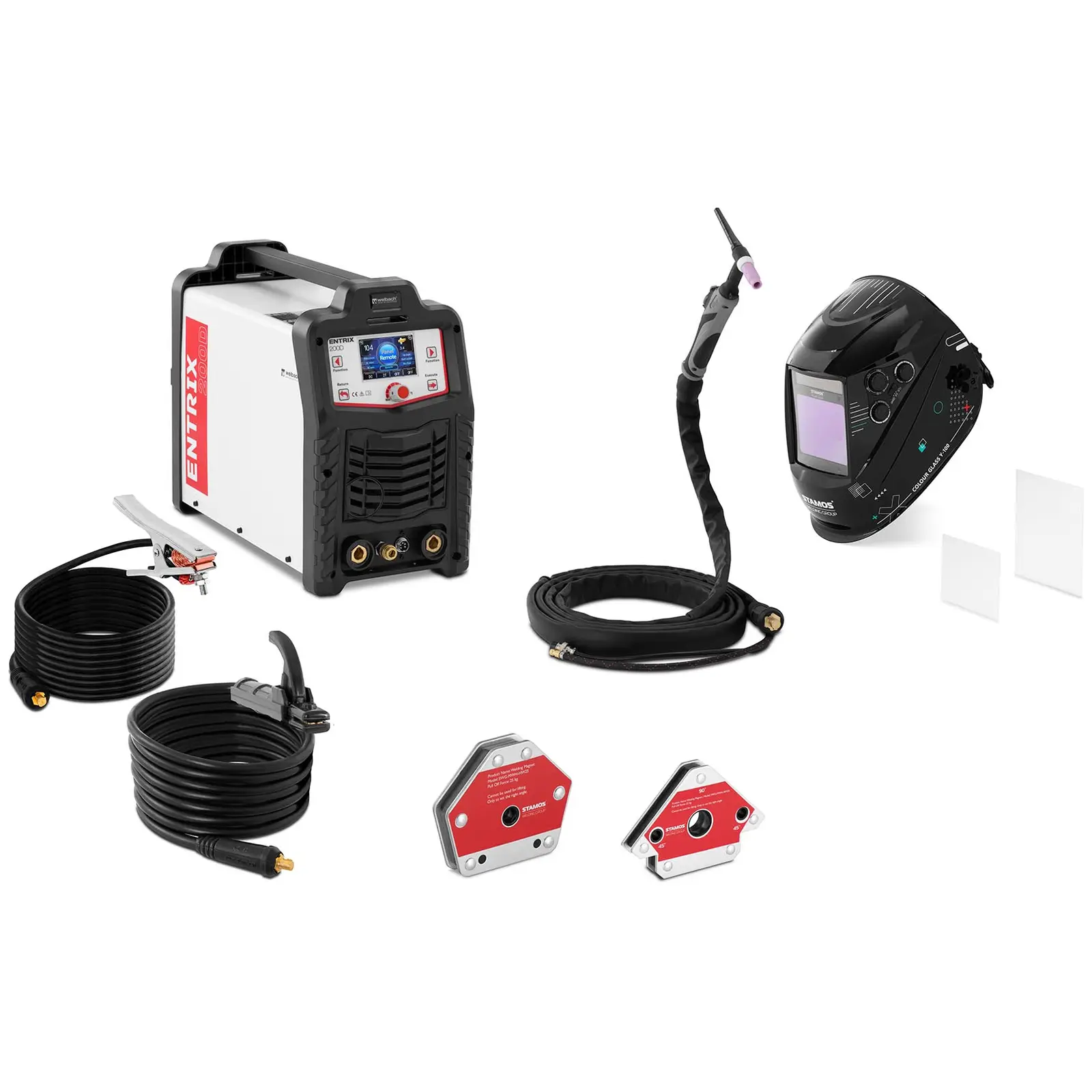 Whether aluminium, steel, stainless steel or copper, you always use the multi-talent with alternating current (AC) as well as direct current (DC) at a welding thickness of 0.5 - 5 mm optimally as required by your workpiece. The selection of all welding parameters and the welding current up to 200 A is very easy on the clearly arranged control panel with LCD display. With just a few buttons and a rotary control, you can regulate all values effortlessly. This is how you achieve precise welding results that are worth seeing! For your safety, you will find the indestructible and colourfast Colour Glass Y-100 welding helmet in the set. In addition, you can precisely weld workpieces together at different angles with the two welding magnets.