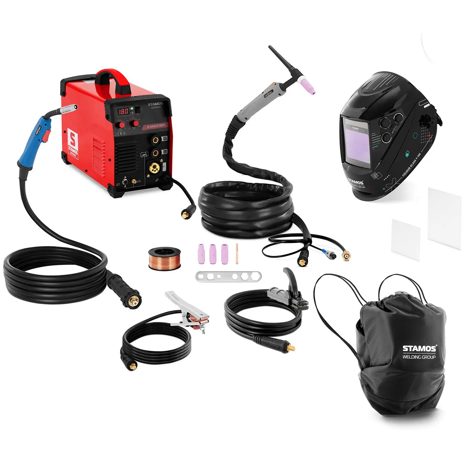 You want the flexibility of a combination welder with solid performance values that is easy to operate? Then use the compact 4-in-1 welding machine S-MULTI 180H from Stamos Germany! Whether you weld with MIG/MAG or TIG up to 180 A or use MMA up to 160 A, the combi welder offers the right welding method for every welding situation with and without gas. For your safety, the Colour Glass Y-100 welding helmet is made of the indestructible TECAMID 66 material blend. Thanks to the coloured field of view, you can see all the details even more precisely.