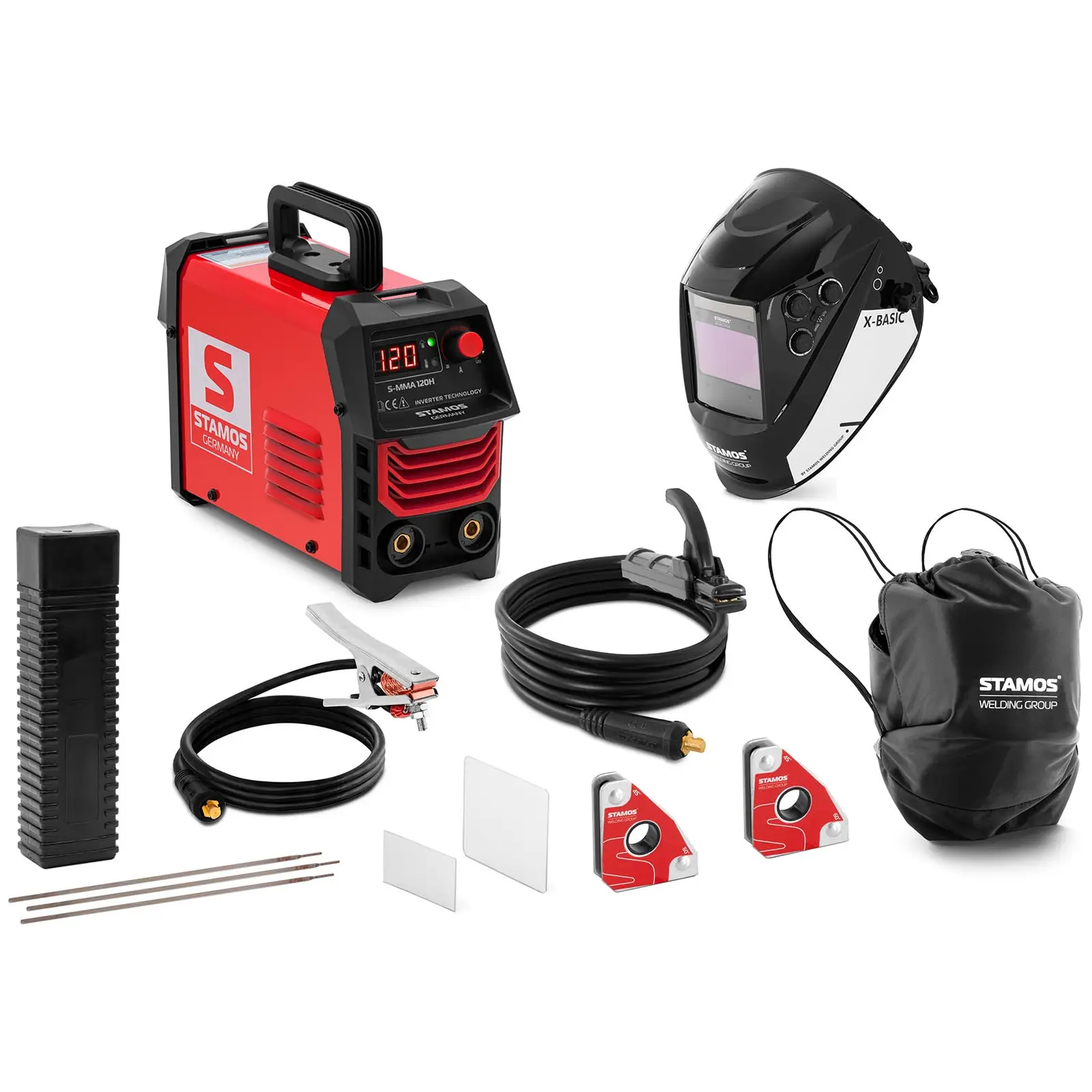 The set of electrode welder, welding helmet, welding angle and stick electrode is convincing for a wide range of welding work