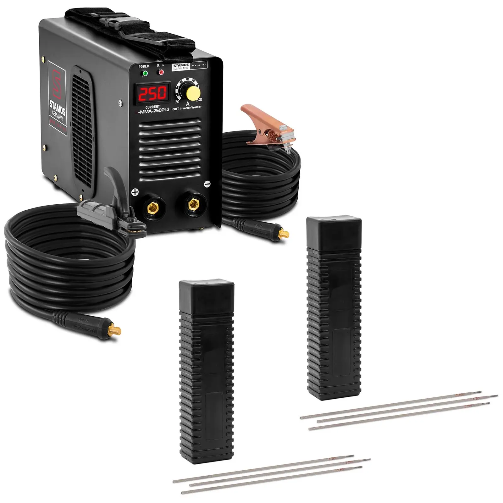 Powerful, safe and mobile - that's what we want in a modern welding machine. The model S-MMA-250PI.2 from STAMOS Germany can handle up to 250 A. And when it's time to go far? Then, thanks to the extra-long 8 m cable, you can weld on a ladder or comfortably larger objects without having to carry the device around all the time. Both E-hand and earth cables are significantly longer than usual welding cables. Are you looking for arc welding electrodes? With the rutile cellulose coated stick electrodes you can effectively weld barges, tank containers and car bodies. These have the dimensions 3.2 x 350 mm, with this set you get two 5 kg packs at once.