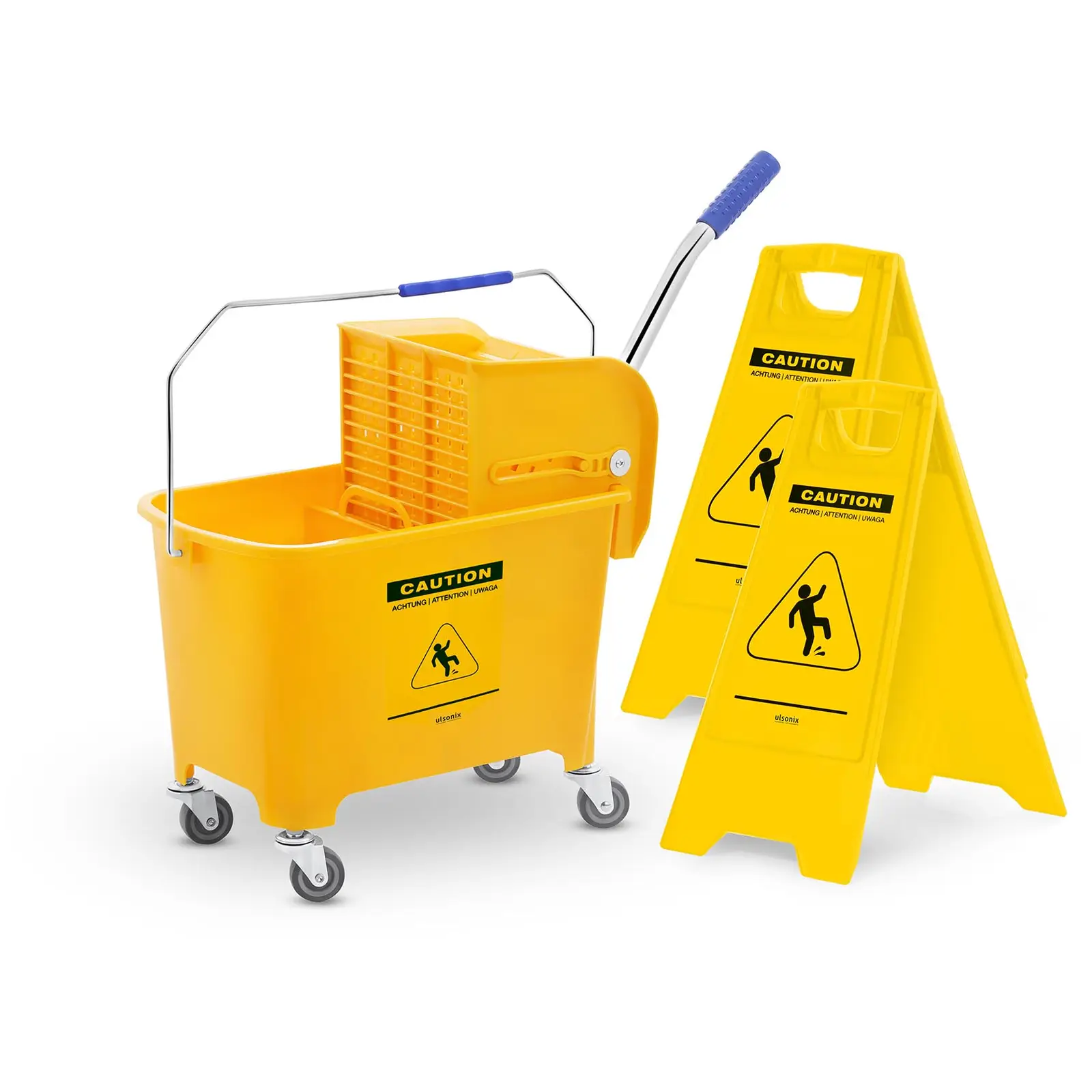The mop bucket is made of high-quality plastic. The material is light and durable at the same time. It insulates heat, so you don't have to worry about high temperatures. It is also impervious to dirt. The wheels are made of thermoplastic rubber, which is not only quiet but also extremely resilient.