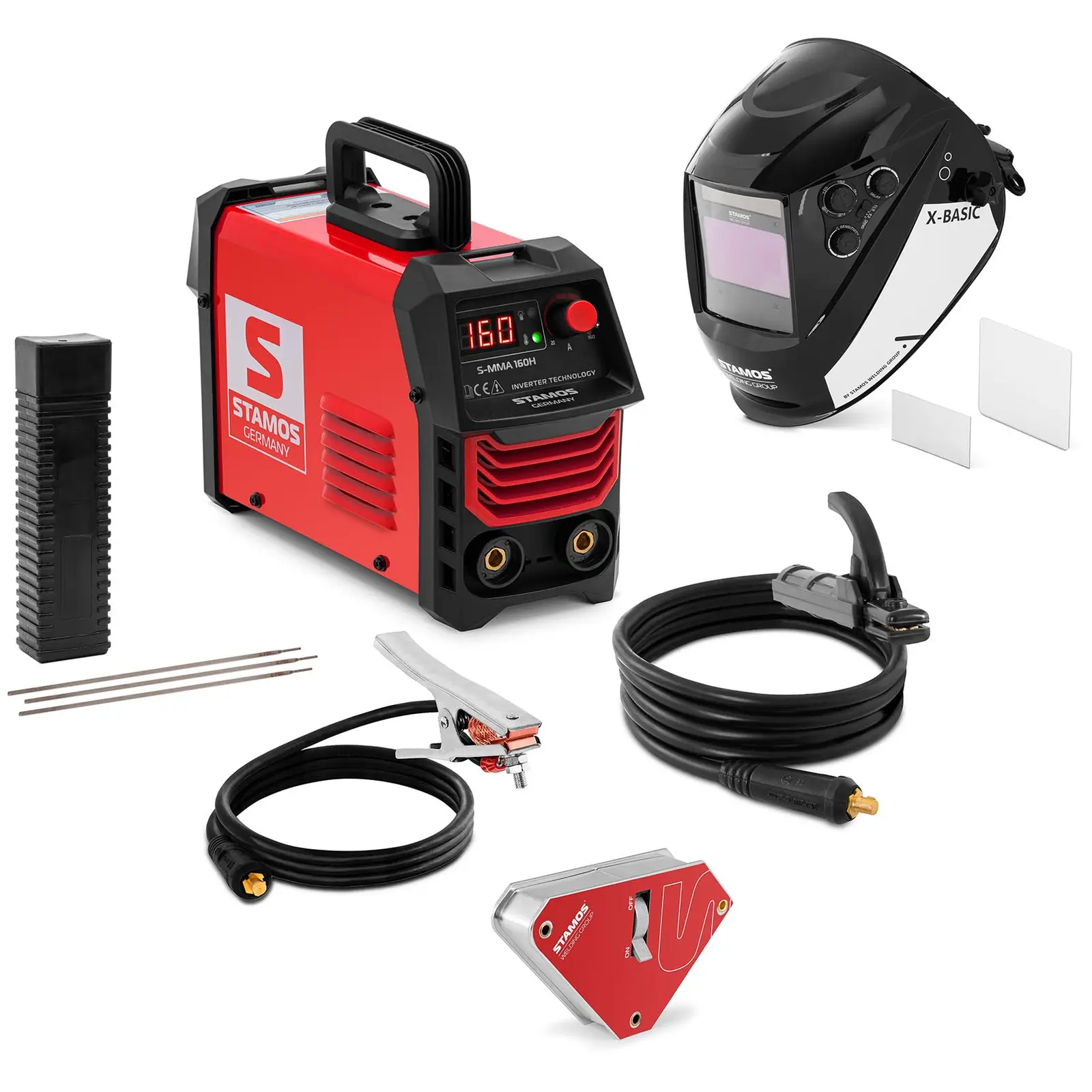 You want a compact electrode welder that you can use in a variety of ways and that impresses you with features such as fast ignition, a stable arc and little welding spatter? Then pick up the hand held MMA welder from welbach! Thanks to the latest technologies and numerous functions, the electrode welder meets all standard work requirements. The X-Basic welding helmet ensures your safety. Thanks to the true colour view, you can see all the details even more precisely. The low-hydrogen iron powder electrode (5 kg included), which has a strong basic coating, has excellent welding properties. In addition, you can precisely weld workpieces together at different angles using the welding magnet with switch.