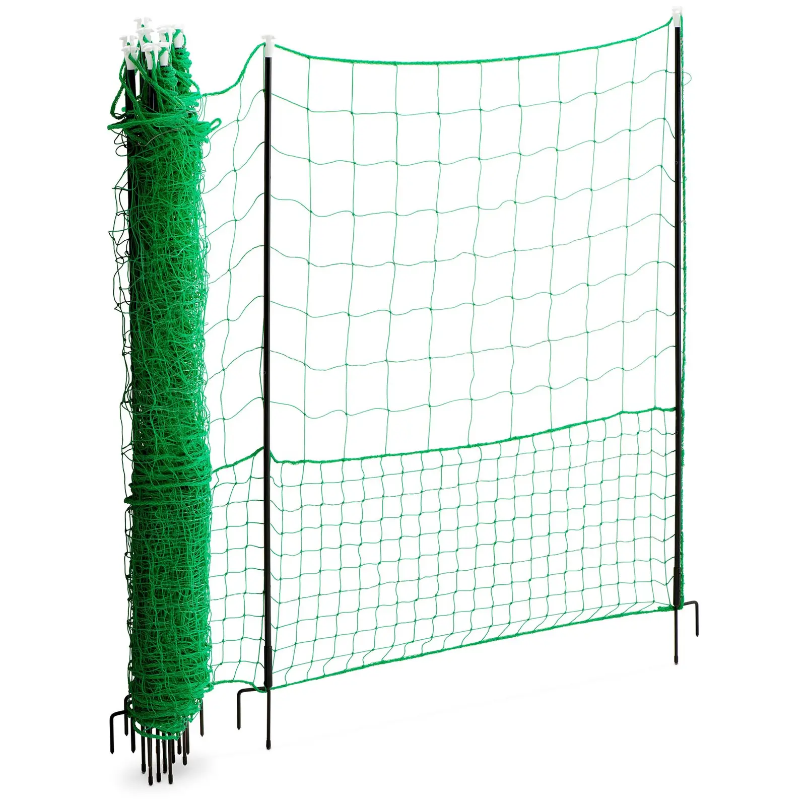 You can quickly erect the poultry fence with the 12 poles made of fibreglass. Securely fasten the poles into the ground with ground hooks and stretch the net between the fastening poles. Thanks to the integrated floor stoppers, you can safely prevent your poultry from escaping from the staked area or from animals such as foxes from entering. Set up the fibreglass poles as you like to build up the poultry net with the necessary tension. For optimum stability, make sure that the poles are no more than 2 m apart.
